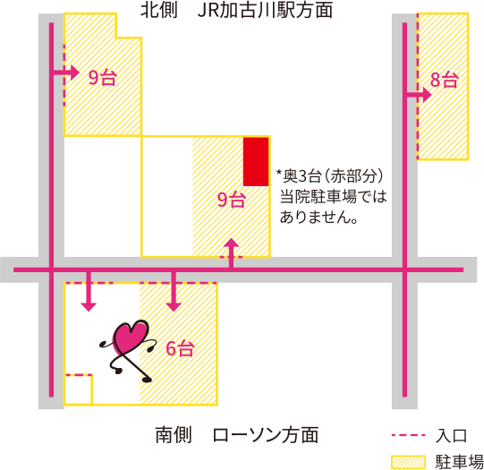 国道2号線、東加古川駅前信号より東のローソンの角を曲がってすぐ。クリニック専用駐車場をご利用ください。